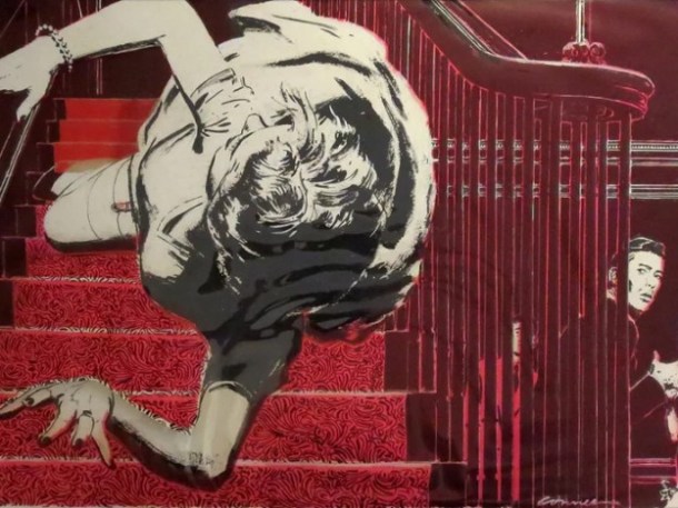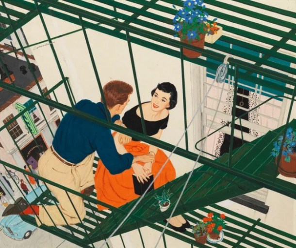 Conner grew up admiring the Saturday Evening Post front covers. Claiming he never considered himself an artist, just someone who liked creating pictures, his images appear influenced more by artists like Degas or Toulouse-Lautrec than by Rockwell. He conceives unusual perspectives and captures fleeting moments with strong angular designs or framing activity with expressive foreground figures or inanimate objects. The previous picture contains a private moment in a fire-escape cage as we spy on the couple from above. We have all sorts of mixed feelings being at such a height, yet free in the open air. These unusual angles and inventive compositions gives such delight in viewing, emphasized by a strong graphic rendering.