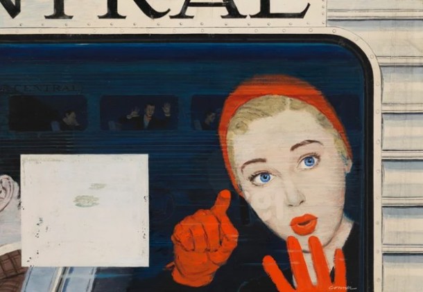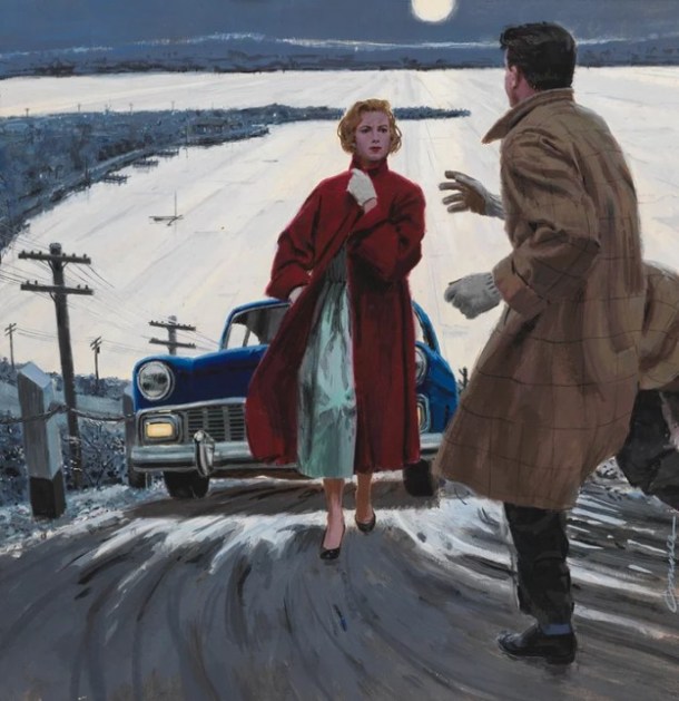 Where’s Mary Smith?, published in Good Housekeeping, 1950. (Notice the gentlemen’s response that we see in the reflection. She is tracing out a word from the moisture on the window.)