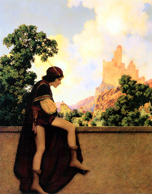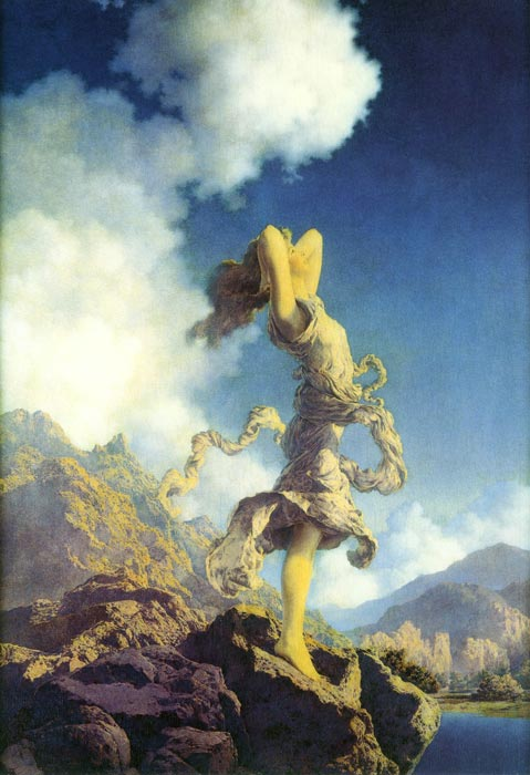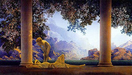 In the above landscape pictures, as in most of his landscapes, one more readily envisages the techniques he used in producing them. Like the artists of the Renaissance, he worked in a monochrome underneath and gradually layered other transparent colors on top, which produced his stunning luminosity, so hard to reproduce in books and other media. Yet just as a printer combines yellow, magenta, and cyan, Parrish would start, say a tree, in blue or a cyan color and successively tint the tree with the other colors. In between the layers, he would apply a coat of varnish to prevent any sort of mixing. After the varnish dried, he would prepare the surface with a bit of scuffing with a pumice stone. The effect not only resulted in a glossy luminescence on the surface but an exquisite level of detail and subtilty in the variation of light and shadow as well as atmospheric perspective. Because, he usually began his pictures with white and blue and the intensity that resulted, his blue became known as “Parrish blue”.