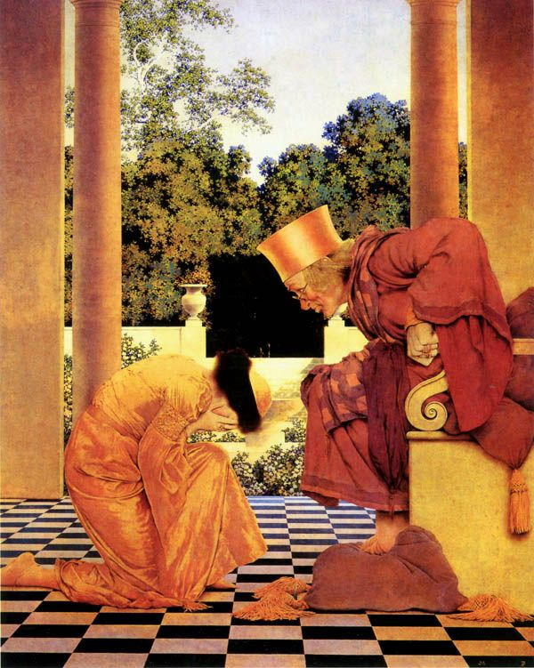 By the 1920s Parrish turned away from illustration and began painting “ars gratia artis” or works produced for their own intrinsic value. He beget a multitude of pictures of fantastical images of androgynous individuals in phantasmagoric environments.
